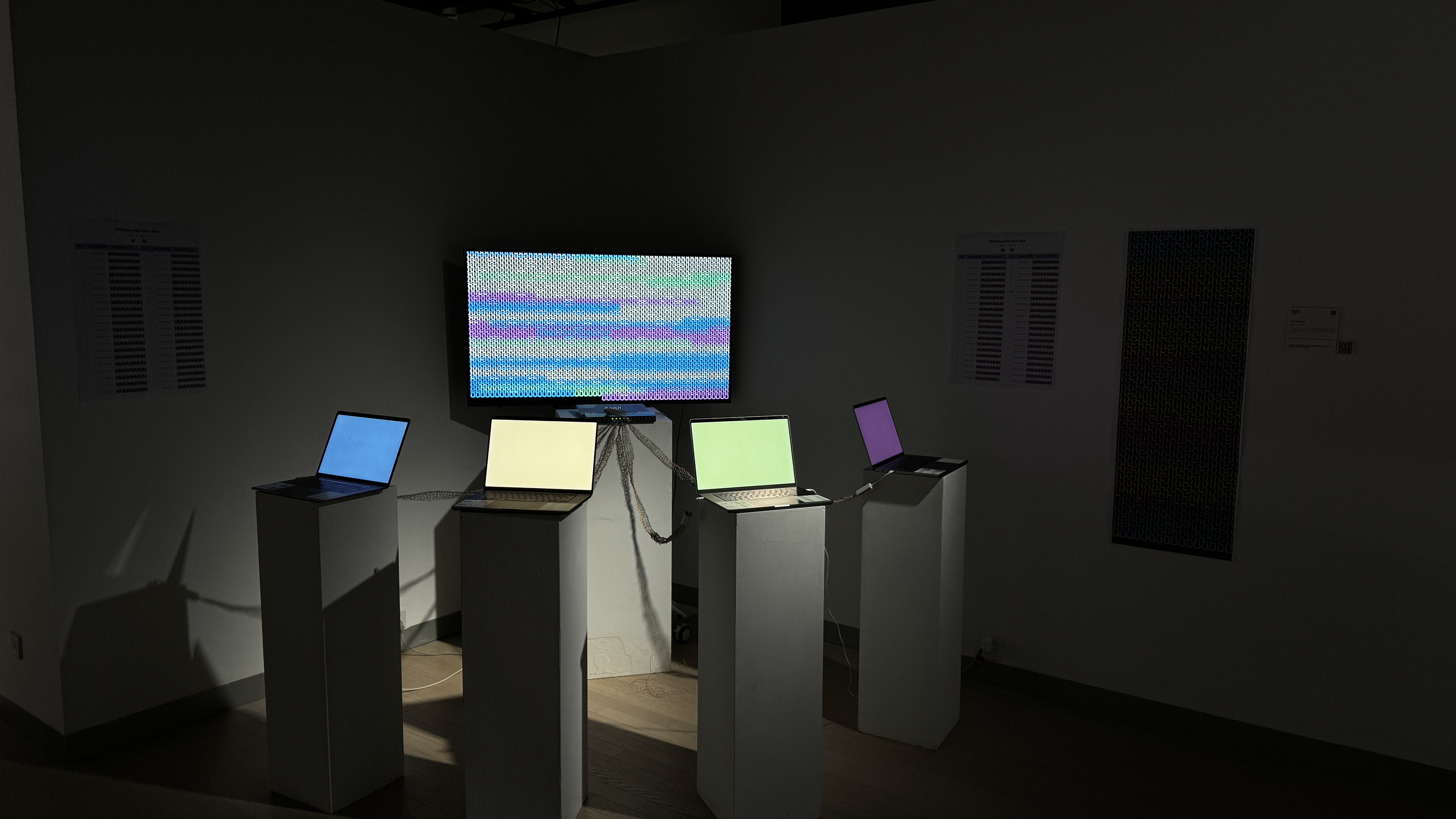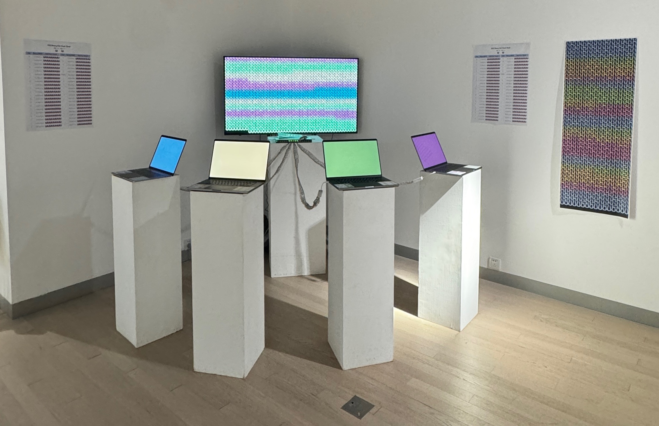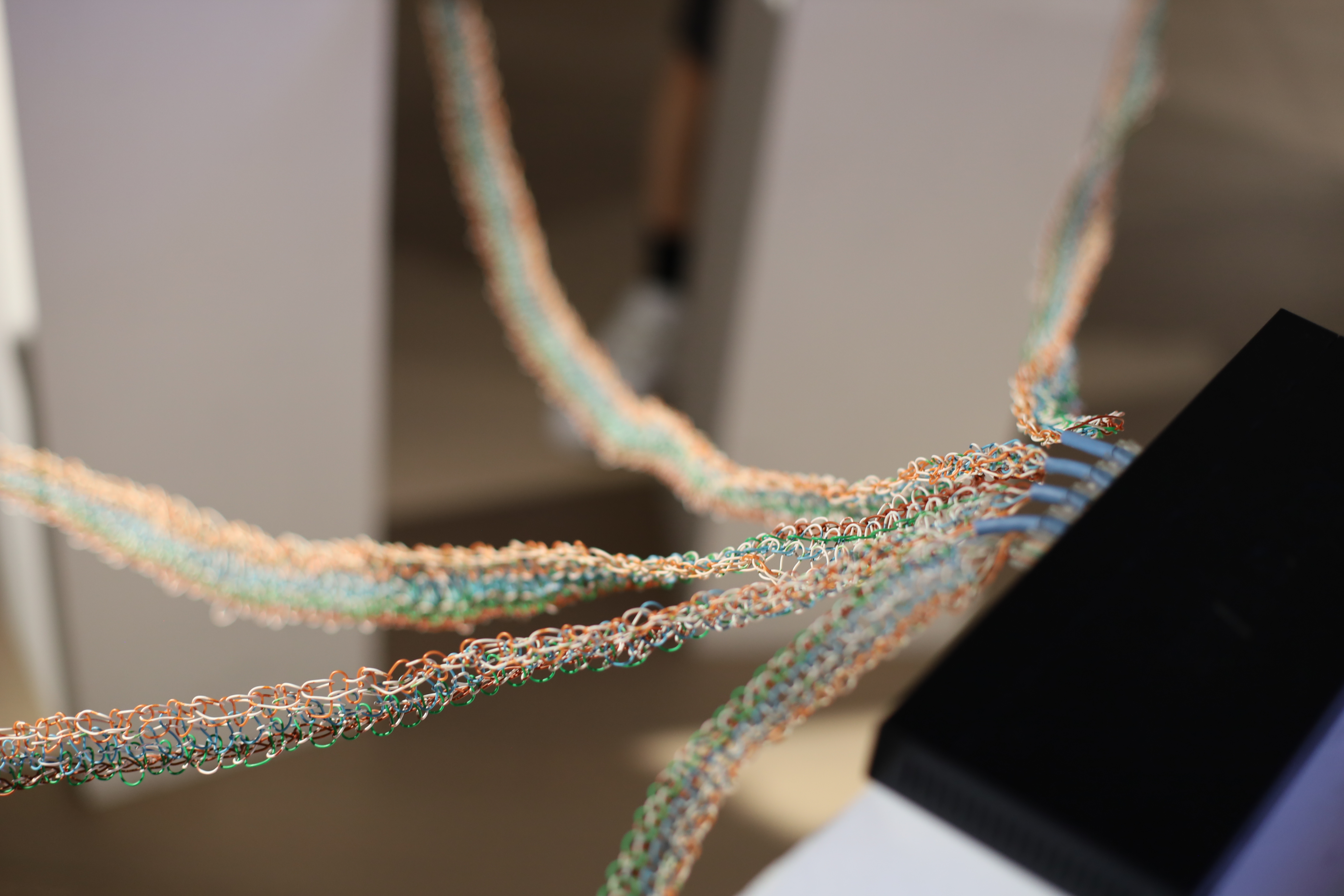 The system consists of four computers and a display, all communicating over a local network connected by deconstructed, hand-knitted, yet fully functional Ethernet cables.